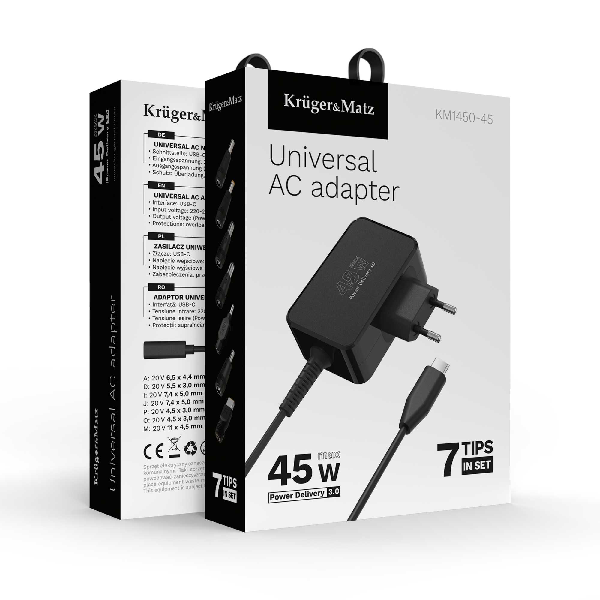 | Nazwa marketingowa | Zasilacz uniwersalny Kruger&Matz 45W z funkcją Power Delivery 7 końcówek |