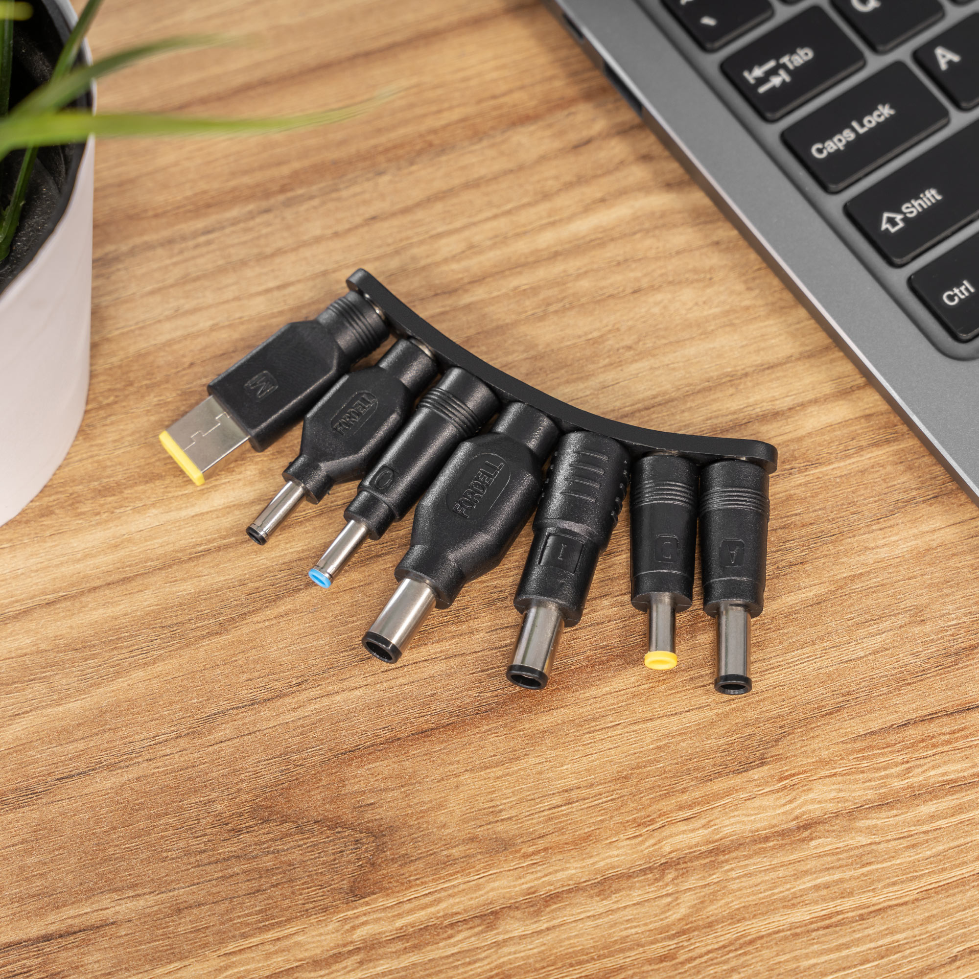 W zestawie znajdziesz aż 7 wymiennych końcówek kompatybilnych z popularnymi markami, takimi jak Dell, HP, Lenovo, Sony czy Samsung. Dzięki temu jeden zasilacz wystarczy do obsługi kilku laptopów w domu lub firmie. To idealne rozwiązanie dla osób korzystających z różnych urządzeń albo szukających zapasowego, uniwersalnego zasilacza.