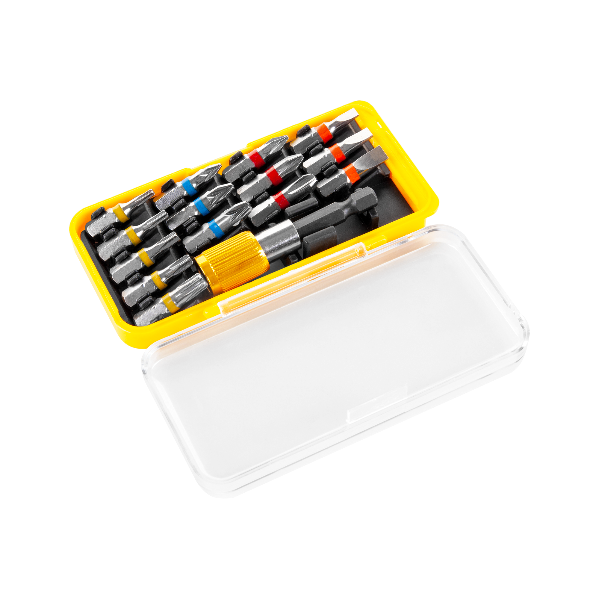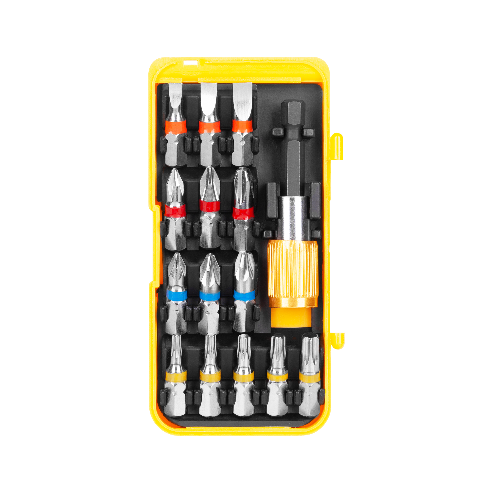 W zestawie znalazło się też 14 wykonanych ze stali chromowo-wanadowej bitów, które dla łatwiejszej identyfikacji różnią się kolorem. Silny magnetyczny uchwyt ułatwia montaż bitów zapewniając stabilną i komfortową pracę. Aby zwiększyć komfort przechowywania, wszystkie elementy zestawu zostały uporządkowane w praktycznym pudełku.