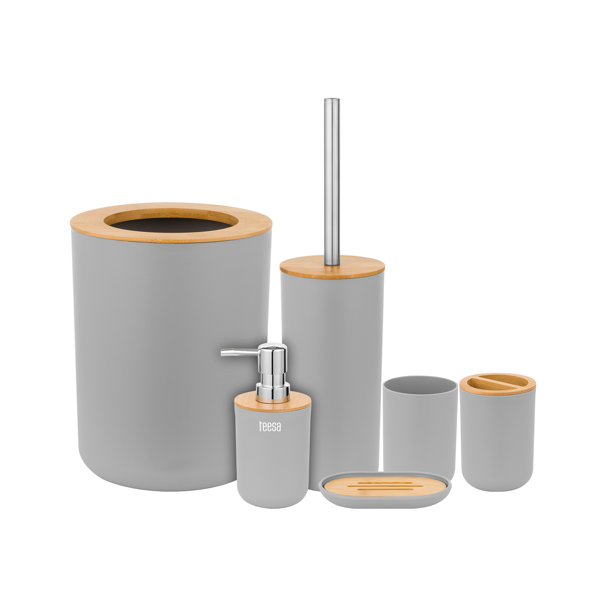 W jego skład wchodzą takie akcesoria do łazienki jak mydelniczka, dozownik mydła, kubek, kubek na szczoteczki do zębów, a także szczotka do WC oraz kosz na śmieci. Wszystkie akcesoria łazienkowe wykonane zostały z wysokiej jakości tworzywa sztucznego z dodatkiem drewna bambusa.