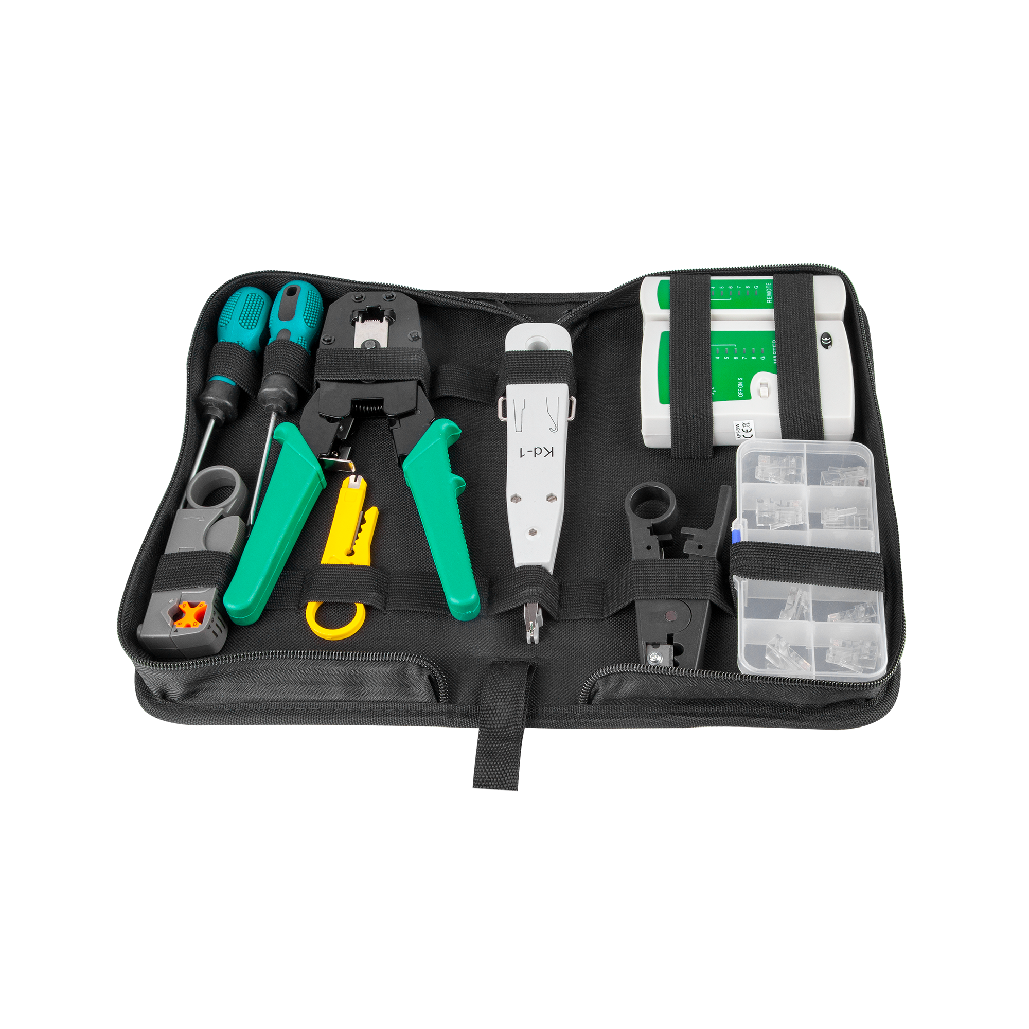 Zestaw narzędzi sieciowych 10-częścowy, służący do budowy okablowania sieciowego oraz telefonicznego (RJ45, RJ11, RJ12) w poręcznym zamykanym futerale.