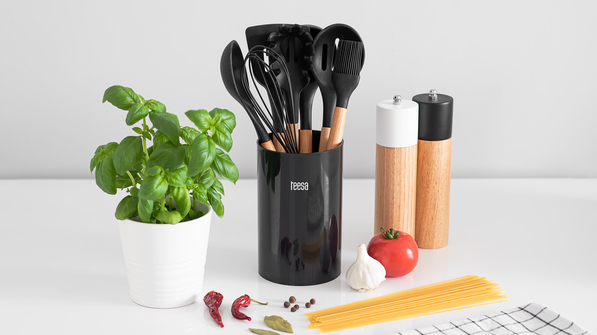 Z myślą o tym został stworzony zestaw przyborów kuchennych Teesa TSA0122, który znakomicie dopełni wnętrza zarówno klasycznych jak i nowoczesnych kuchni. W jego skład wchodzą wszystkie najczęściej stosowane akcesoria, niezbędne do przygotowania codziennych posiłków. tj. chochla, łyżka do serwowania oraz do makaronu, łopatka i łyżka cedzakowa, pędzelek i trzepaczka.