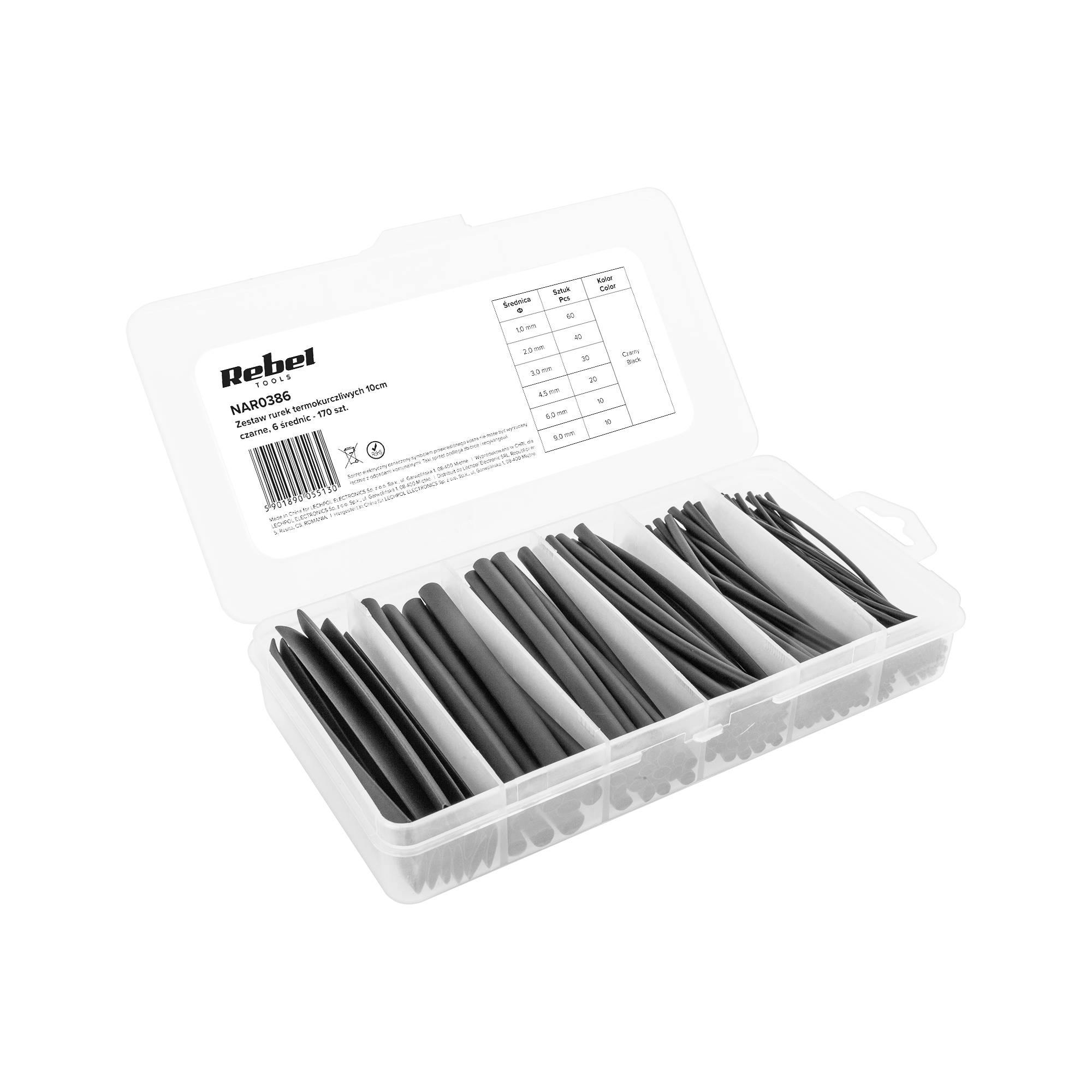 | Nazwa marketingowa | Zestaw rurek termokurczliwych 10 cm. czarne, 6 średnic- 170 szt. |